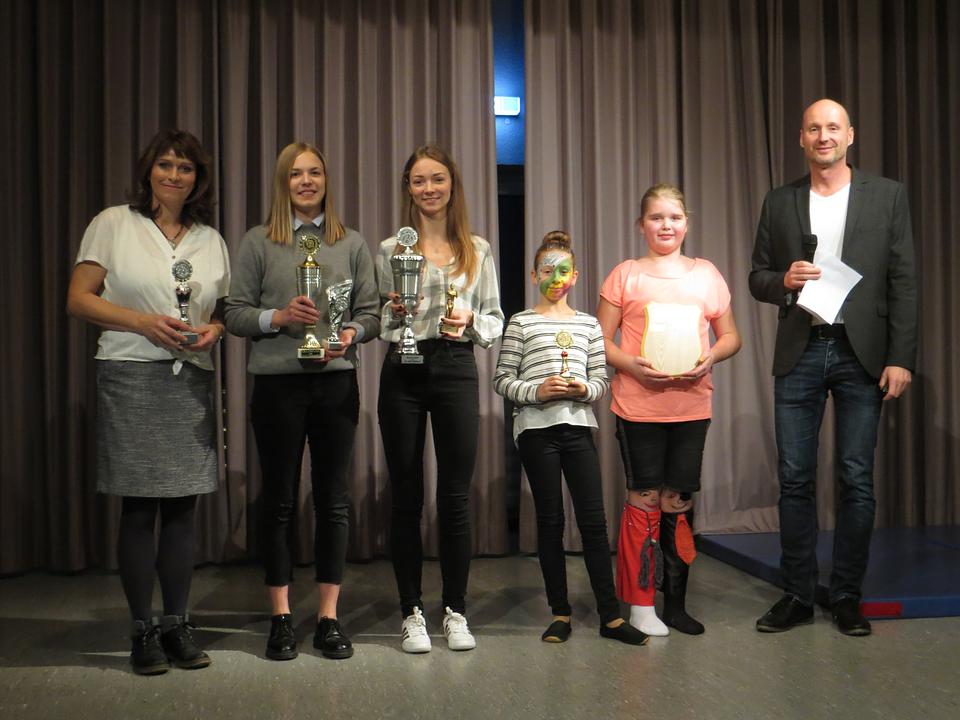 Wie die Vorführung, so gehören auch Ehrungen zum festen Programmteil des Abends. Die Leichtathleten nutzen den Familienabend um ihre Besten zu Ehren. Als Sportler des Jahres wurden in diesem Jahr Lena Müller und Emily Bieber mit den Wanderpokalen geehrt. Als Kreisbeste des Jahres 2019 im Ballwurf wurde zudem Larissa Eichler mit einem Sonderpokal ausgezeichnet. Das Wanderbrett für die Trainingsfleissigsten ging in diesem Jahr an Lilly Kaden und Luna Mohrmann. Das auch Trainer für Meistertitel gut sind hat in diesem Jahr Regina Imming bewiesen. Sie wurde Kreismeisterin im Kugelstoßen ihrer Altersklasse und konnte einen Pokal als Andenken in Empfang nehmen.