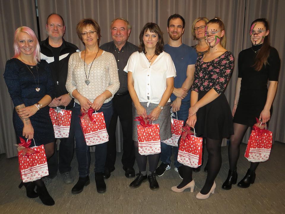 Bevor die letzten Preise der Tombola verteilt wurden, bat der 1. Vorsitzende Dieter Schmidt die Übungsleiter auf die Bühne und bedankte sich im Namen der Sportler und des Vorstandes für den ehrenamtlichen Einsatz. Ohne das große Engagement kann als kleiner Verein kein so breites Sportangebot geboten werden. Trotz allem wies er darauf hin, dass auch weiterhin Übungsleiter und auch Helfer benötigt werden. Dem Aufruf für einen Platz- und Gerätewart haben sich spontan zwei junge Interessenten gemeldet.