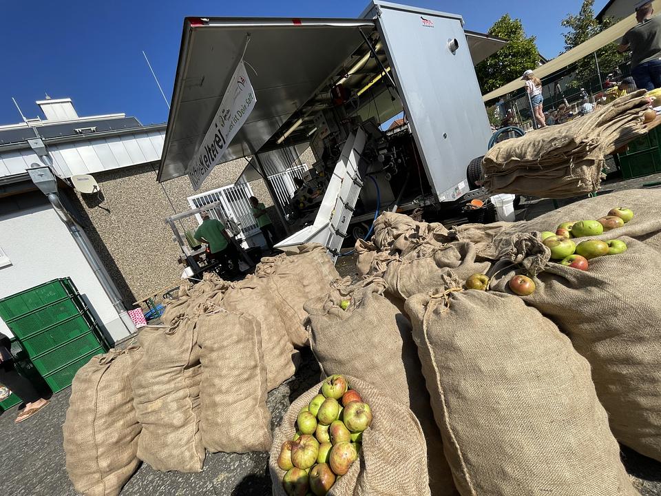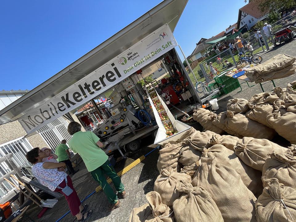 An der Mehrzweckhalle in Berstadt war die mobile Kelterei des Streuobstzentrums am Lohrberg stationiert, in der die Äpfel direkt vor Ort zu leckerem Saft verarbeitet und haltbar gemacht wurden. Um das Pressen für die Kinder anschaulicher zu gestalten, hat Klimaschutzmanager Markus Michel eine kleine Spindelpresse mitgebracht und gemeinsam mit den Kindern selbst Saft gepresst. Ein Großteil des Saftes stammte sicherlich aus der mobilen Kelterei. Mehrere hundert Liter werden nun an die Kitas verteilt. Dort ist er Teil des Konzeptes zur gesunden Ernährung und wird zu besonderen Anlässen wie Geburtstagen oder Festen angeboten.
