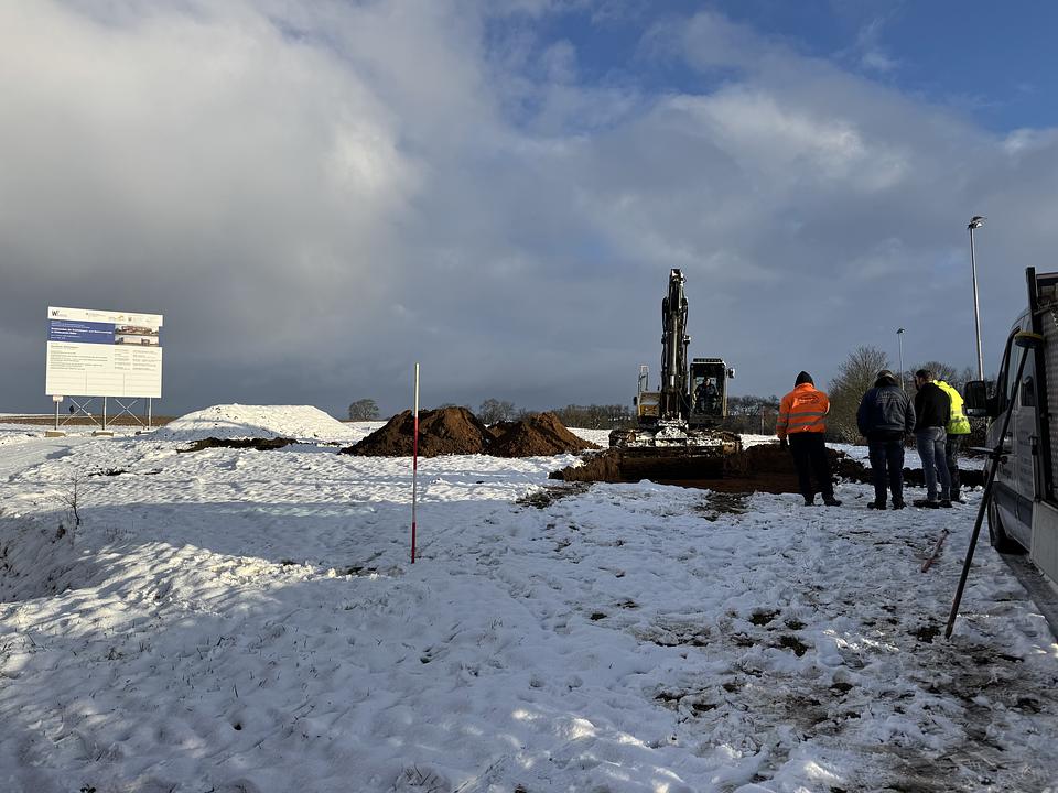 Neben dem Bauschild wurde damit begonnen, eine Baustraße als Zufahrt auf das Gelände herzustellen. Zum Beginn der Woche konnten die ersten Archäologischen Untersuchungen starten. Wie an vielen Stellen in der Wetterau ist man bereits nach kurzer Zeit auf Funde gestoßen, die nun näher untersucht werden müssen. Der offizielle Spatenstich ist in einigen Tagen geplant.