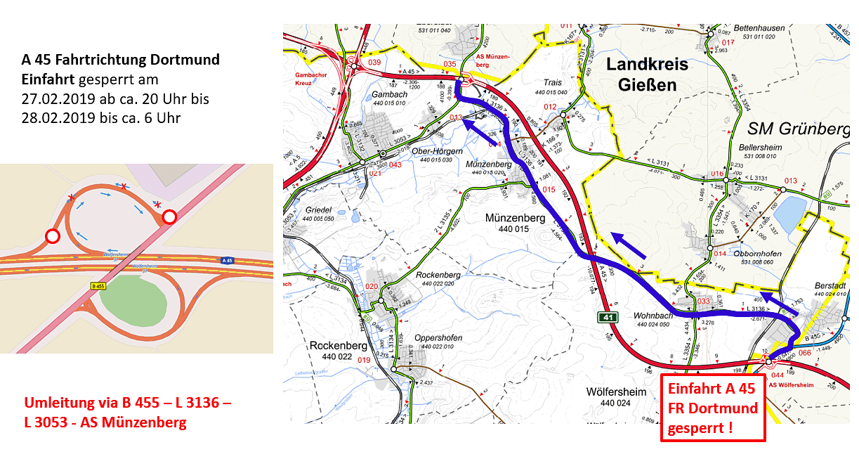 In den Nächten am Mittwoch und Donnerstag, den 27.02. und 28.02. erfolgen ab ca. 20 Uhr bis ca. 6 Uhr die Arbeiten dann analog an der Einfahrt zur A 45 in Richtung Gießen/Dortmund. Die ausgeschilderte Umleitungsstrecke führt auf der B 455 bis Berstadt, von dort abzweigend auf die L 3136 über Wohnbach und Münzenberg auf die L 3053 bis zur Anschlussstelle Münzenberg.