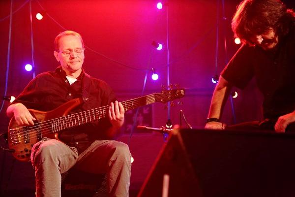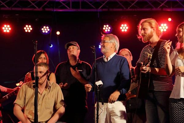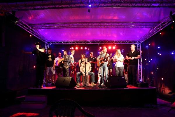 Nach Mains letztem Titel kehrte auf der Bühne jedoch keine Ruhe ein. Moderator Arnold bat nochmal alle Künstler auf die Bühne zu einem gemeinsamen Finale. Völlig ungeprobt spielten die versierten Musiker den Titel "Stand by me", zu dem das Publikum laut einstimmte. Zu den Klängen von Bass, Gitarre und Cajon bedankte sich Organisator Göbel bei allen Musikern, die seiner Einladung gefolgt waren, aber auch bei den zahlreichen Menschen, die nicht auf der Bühne standen. Besonders hob er dabei die Bäckerei Hinnerbäcker und die Sparkasse Oberhessen hervor, die die Veranstaltung finanziell unterstützt haben. Als festen Partner bei der Veranstaltung kann man sich auf den Eltern-Kind-Verein verlassen. Das Vorstandsteam des Vereins unterstützt nicht nur beim Verkauf von Getränken, sondern auch bei Aufbau und Dekoration. Dank richtete er auch an Michael Bauer, dem es in jedem Jahr wieder gelingt, einen perfekten Sound auf und vor der Bühne zu mischen, Robin Buß und Nina Gerlach, die den Abend auf Bildern und Videos dokumentiert haben. Videos werden in den nächsten Wochen im Youtubekanal zu Freies im Gesang veröffentlicht. Dort stehen auch Mitschnitte aus dem vergangenen Jahr zur Verfügung.