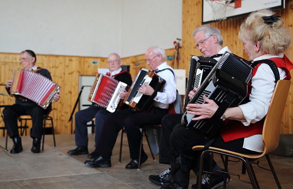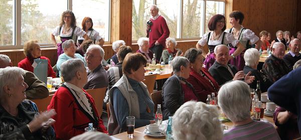 Nach der Ehrung übergab Sauer das Wort an Klaus Kötter, der durch das Programm führte und dies auch selbst zusammengestellt hatte. Wie Klaus Kötter mitteilte, musste das Programm aufgrund der vielen „Ausfälle“ etwas überarbeitet werden. Einen besonderen Dank richtete auch Kötter an Martina Schmitt und lobte die von der Gemeinde organisierten Angebote, wie den Seniorenausflug, den Seniorennachmittag oder den Schwimmbadbus für Schüler und Senioren während der Ferien. Im Programm waren die Wohnbacher Landfrauen mit Volkstänzen in ansprechenden Kostümen und einer Reise durch die Jahreszeiten zu sehen. Der gut intonierte Chor Laudate cum Musica überzeugte mit kurzen Liedern zum Frühling. Die Teenager-Spätlese stellte ihr Können unter anderem bei einem schottischen Tanz unter Beweis und sorgte mit Tempo und Dynamik für Begeisterung bei den Zuschauern. Pfarrer Wolfgang Kaiser trug mit einem Impuls zum Nachmittag bei. Die beliebten Berschdbacher sangen mehrere Lieder, wie zum Beispiel „Freude schöner Götterfunken“ mit einem abgewandelten Text. Ganz ohne Text und Noten kam der Harmonikaclub zurecht, der wie in den vergangenen Jahren für eine musikalische Untermalung sorgte. Für die Bewirtung und Dekoration waren ebenfalls die Landfrauen verantwortlich. Kurz nach 17.00 Uhr ging ein geselliger Nachmittag in Wohnbach zu Ende, und der von der Gemeinde organisierte Bus brachte die Senioren wieder zurück in alle Ortsteile.