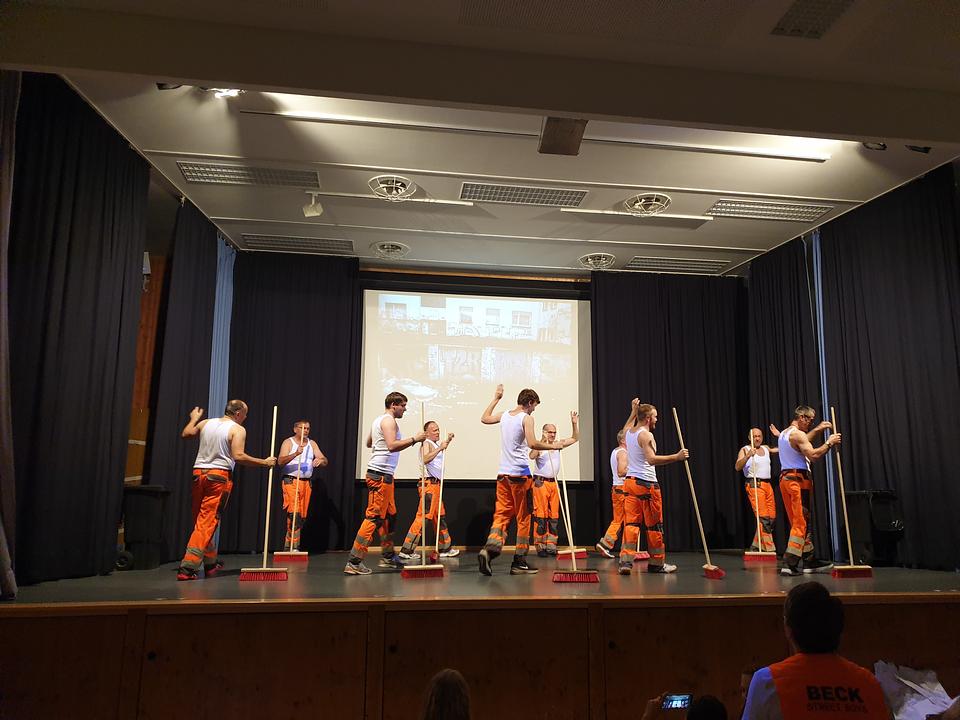 Im zweiten Teil des Abends ging es sportlich weiter. Die Tanzgruppe A45 nahm das Publikum mit auf eine Flugreise in ferne Länder und erntete dafür viel Applaus. Anschliessend war eine längere Umbaupause notwendig, denn nun war die Gerätturngruppe am Start. Am Barren, Schwebebalken und auf der neuen „Mini“-Aitrackbahn zeigten die Jungen und Mädchen ihr Können. Durch Schwarzlichtbeleuchtung war dies ein wahrer Augenschmaus. Der Abend endete, wie bei allen großen Events, mit der Reinigung des Veranstaltungsortes. Dazu waren die 10 Herren der Freitagsriege engagiert worden, die zeigten, wie der Besen auch als Sportgerät dienen kann.