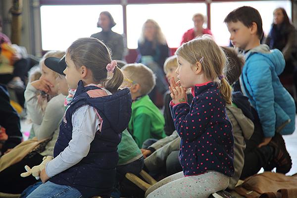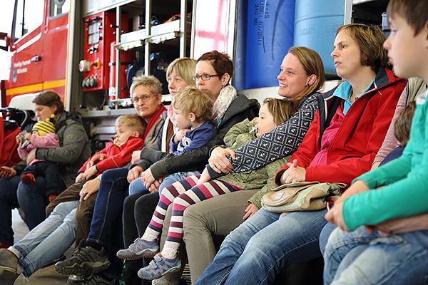 Zwischen den beiden Feuerwehrautos im Feuerwehrhaus in der Wölfersheimer Seestraße lagen bereits Kissen auf dem Boden bereit. Claudia Lang begrüßte alle Kinder und Eltern persönlich. Die Kinder konnten direkt auf den gemütlichen Kissen und die Eltern auf den im Kreis darum aufgestellten Bänken Platz nehmen. Kaum ging es los, klebten die Kinder an Langs Lippen. Sie las Geschichten von Finn dem Feuerwehrelch, Feuerwehrmann Sam und der Feuerwehrtruppe, die einfach keinen warmen Kaffee bekommen kann. Während dem Lesen zeigte sie immer wieder Bilder in ihrem Kamishibai, einem Holzkasten mit Zeichnungen, die umgeblättert werden, und bezog die Kinder in die Handlung der Geschichte ein.