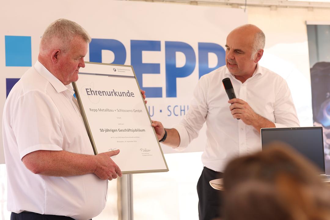 Stefan Füll, Präsident der Handwerkskammer Wiesbaden, überreichte Alexander Repp eine Ehrenurkunde zum 50-jährigen Bestehen der Firma - ein Jubiläum, das pandemiebedingt erst jetzt, drei Jahre später, nachgefeiert werden konnte. Alexander Repp ist nicht nur Unternehmer, sondern auch ehrenamtlich stark engagiert: als Präsident der Arbeitgeberverbände des Hessischen Handwerks, als Landesinnungsmeister Metall, im Vorstand der Handwerkskammer Wiesbaden, in Gewerbevereinen, als ehrenamtlicher Richter am Arbeitsgericht Gießen – und seit 2014 auch als Nikolaus in Reichelsheim. Dass er dabei mit Leidenschaft und Ausdauer vorangeht, brachte es Handwerkspräsident Füll auf den Punkt: „Wenn er sich festgebissen hat, lässt er nicht mehr los.“