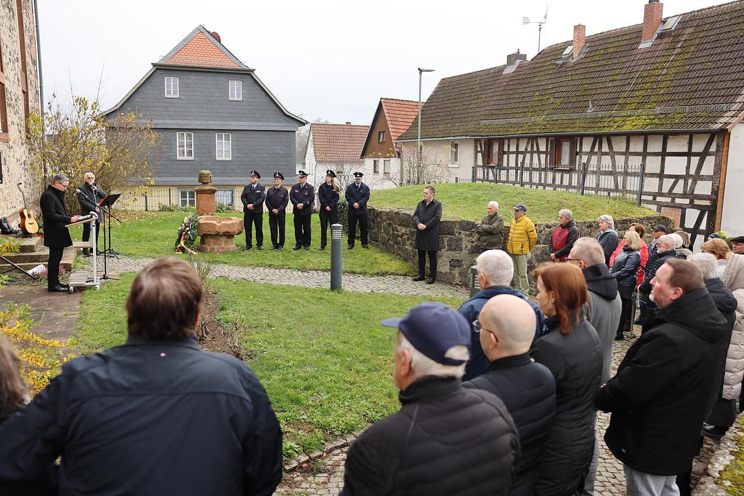 Die Gedenkfeier wurde in diesem Jahr musikalisch besonders gestaltet: Musiker Thomas Gerlach nahm die Anwesenden mit auf eine „musikalische Zeitreise“, die Friedenslieder vom Mittelalter bis in die Neuzeit vereinte. Alte Melodien, moderne Klänge und nachdenkliche Texte verbanden sich zu einem würdevollen Rahmen, der die Bedeutung des Tages eindrucksvoll unterstrich.
