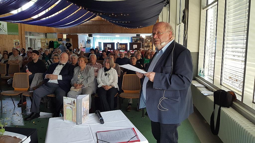 Der neue Wölfersheimer Bürgermeister Eike See bedankte sich für die Ehrung, gratulierte seinerseits den Melbacher Bürgerinnen und Bürgern und brachte zum Ausdruck, dass er „stolz sei, Bürgermeister einer Gemeinde mit solchen Ortteilen zu sein!“ Der bekannte Wölfersheimer Autor Eugen Rieß stellte im Anschluss daran sein neuestes Werk unter dem Titel: „Melbach-Meelbach-Melpach-Melbbach-1200 Jahre mitten in der Wetterau“ vor, das den Ehrengästen als Geschenk und Erinnerung überreicht wurde. An zahlreichen Beispielen veranschaulichte der Autor die abgehandelten Themenfelder. Gerne hätte Eugen Rieß weitere Kapitel hinzugefügt, so spannend seien die „1200 Jahre gelebtes Leben zwischen zwei Buchdeckeln“ geworden, wie Thomas Gerlach das Werk angekündigt hatte, aber das Format von 640 Seiten hätte Grenzen gesetzt.