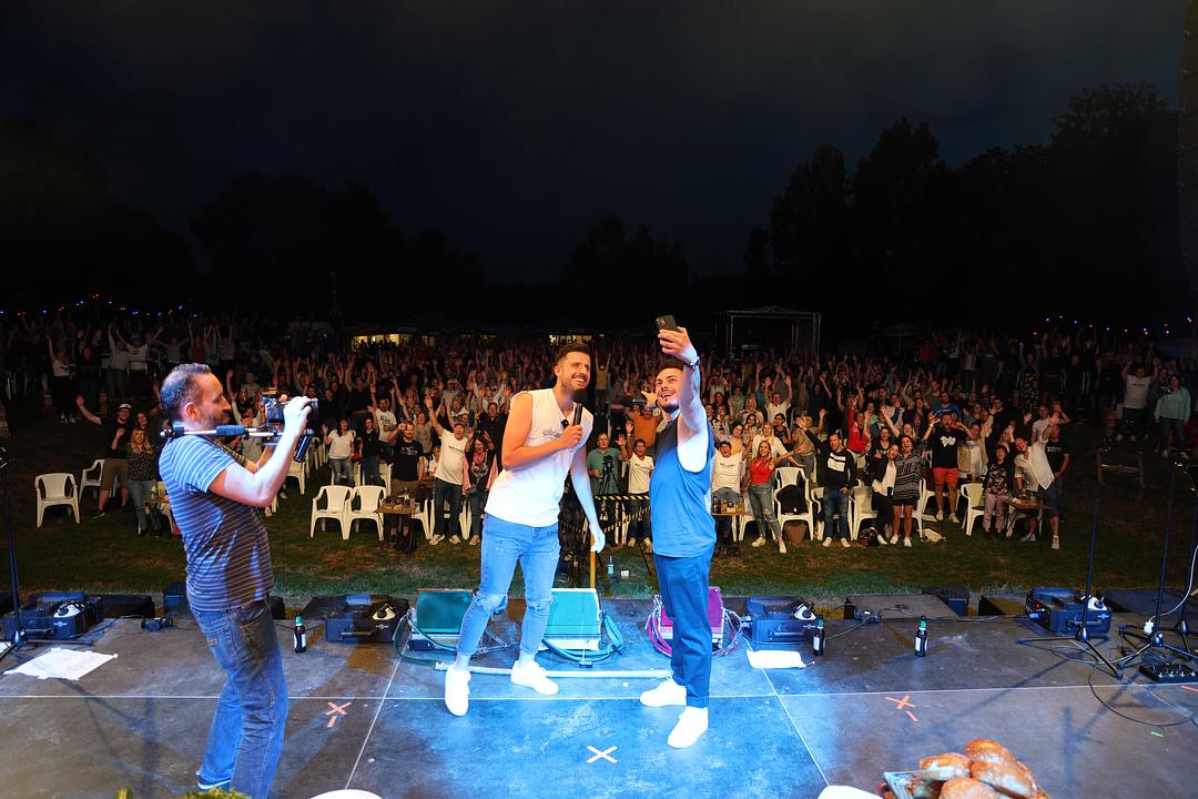 „Wir sind von hier und wir machen Musik von hier“, sagt Marcel Heller, der am Schlagzeug unter anderem mit einem minutenlangen Solo brilliert, während Dennis Schulz mit der steirischen Harmonika über die Bühne wirbelt und dem satten Sound der Band den volkstümlichen Touch gibt.