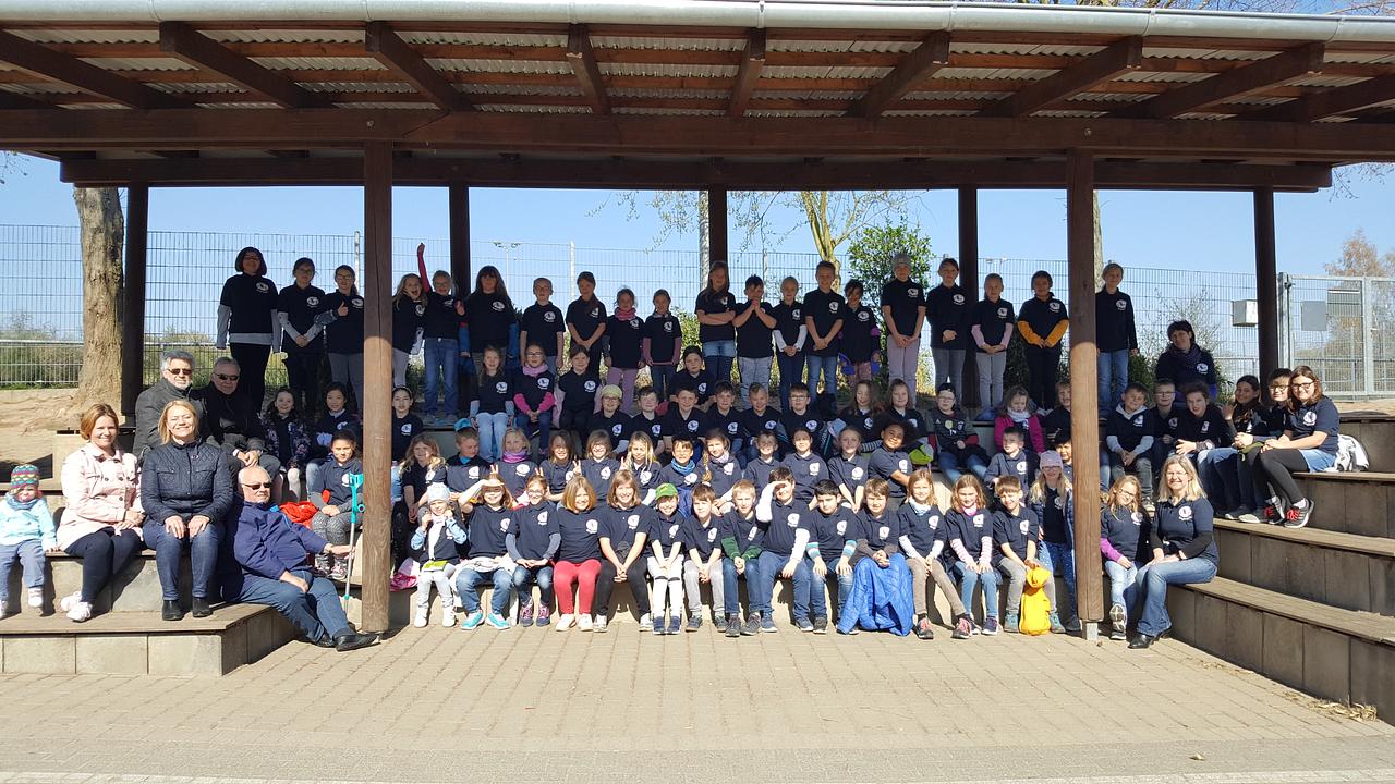 Auswahl und Gestaltung der T-Shirts organisierten Karin Lingner und Christina Scop, Lehrerinnen und Leiterinnen des musikalischen Bereichs an der Jim-Knopf-Schule. Schulleiterin Claudia Zaborowski sprach ihnen im Namen der Schulgemeinde ein herzliches Dankeschön aus. Ein weiteres Dankeschön ging an den Förderverein der Wölfersheimer Schulen, der die Anschaffungskosten in Höhe von 1400,- € spendierte übernahm. Einige Vorstandsmitglieder, unter anderem der Vorsitzende Thomas Gerlach, Kassenwart Ulrich Bommersheim sowie Katharina Rüd und Horst Diether waren gekommen, um sich selbst ein Bild vom Können der Jim-Knopf-Singknöpfe zu machen. Neben Frühlingsliedern wurden ein Osterhasenlied sowie ein Kanon gesungen. Traditionell gab es auch wieder das Geburtstagslied für alle großen und kleinen Kinder.