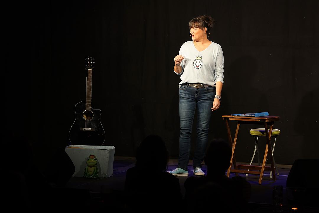 Am Samstag war Kabarettistin Rena Schwarz zu Gast. „Prinzessin ist auch kein Traumjob“ heißt das zehnte Soloprogramm der gebürtigen Bielefelderin, die seit einigen Jahren in einem kleinen Spessartdorf an der hessischen Grenze eine neue Heimat gefunden hat. Mit ihrem Programm „Prinzessin ist auch kein Traumjob“ nahm sie die Zuhörer mit auf eine Reise in die Märchenwelt. Warum Mädchen so gern Prinzessin sein möchten? Rena Schwarz kann das nicht verstehen. Um das zu ändern, zeigt sie den Mädchen gerne ein Foto von Prinz Charles – und wenn das nicht genügt eins von seiner Camilla. Und damit hat sich die Sache. Die Schauspielerin, Komödiantin und Sängerin verstand es, das Publikum in ihr Programm miteinzubeziehen. Zum Beispiel beim Märchenraten, bei dem sich die Goldmünzen verdienen konnten. Rena Schwarz hat adelige Wurzeln und wuchs sogar in einem Schloss auf – „mein Vater war der Hausmeister“. In der Schule war sie deshalb immer die „Rena vom Schloss“. Das hat geprägt und so ziehen sich die Märchen bei ihr auf unterschiedlichste Weise durch ihr Leben. In Melbach vertonte sie unter anderem „Schneewittchen“ musikalisch und packte „Hänsel und Gretel“ in ein Singgedicht, bei dem das Publikum fleißig mitsingen durfte. Apropos „Hänsel und Gretel“. Das Märchen übertrug Rena Schwarz in die heutige Zeit. Statt „Hänsel und Gretel“ hießen die Kinder in ihrer Geschichte Jamie-Maurice und Jaqueline-Chantal. Sie leben in Hanau-Wolfgang, der Vater ist arbeitslos, die Stiefmutter Nageldesignerin. Und aus Geldnot werden sie im tiefen Wald des Frankfurter Rotlichtmilieus ausgesetzt. Die Zuschauer waren begeistert und so war es nicht verwunderlich, dass auch Schwarz mit Zugabe-Rufen belohnt wurde.