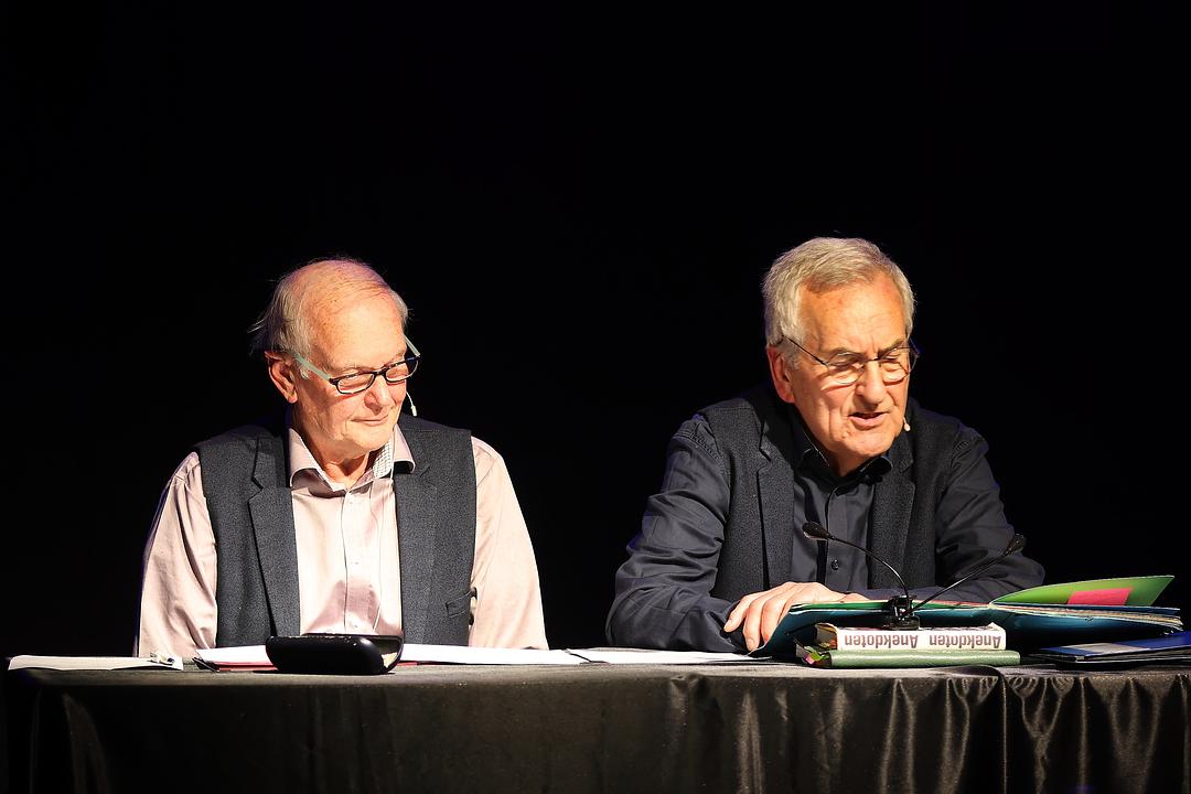 Ihren Abschluss fand die Wölfersheimer Kleinkunstwoche und damit auch die Veranstaltungen im Rahmen des 50-jährigen Gemeindejubiläums mit einer Lesung von Herbert Meyer und Gerd Wächter. Seit inzwischen mehr als 10 Jahren finden die thematischen Lesungen der pensionierten Pädagogen statt, bei denen sie sich auch immer musikalische Unterstützung gesucht haben. Als einen „Höhepunkt der Kleinkunstwoche“ bezeichnete die Wetterauer Zeitung den rundum gelungenen Abend und das war es sicherlich auch. Vor ausverkauftem Haus mit vielen Gästen, die sich den beiden Rezitatoren seit ihrer eigenen Schulzeit verbunden fühlen, entfaltete das Duo die Bedeutung des Humors gerade in schweren, krisengeschüttelten Zeiten. Ihrer ganz aktuell zusammengestellten Lesung stellten sie das Wort des englischen Publizisten und Pädagogen Jean Paul (1763 bis 1826) voran: „Die Freude und das Lachen sind der Sommer des Lebens.“ Das anschließend entfaltete reichhaltige literarische Spektrum umfasste den Humor im Alltag, in der Liebe und im Beruf, den Humor des Kindes und des alternden Menschen, den schwarzen Humor und den bodenständigen Mutterwitz, natürlich auch in Wetterauer Mundart.