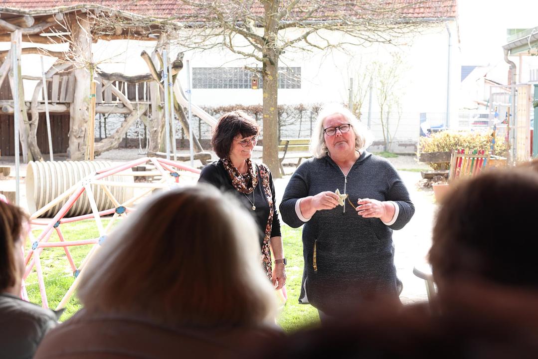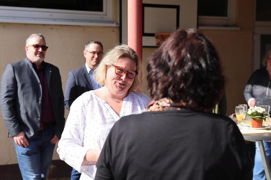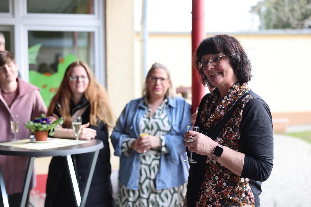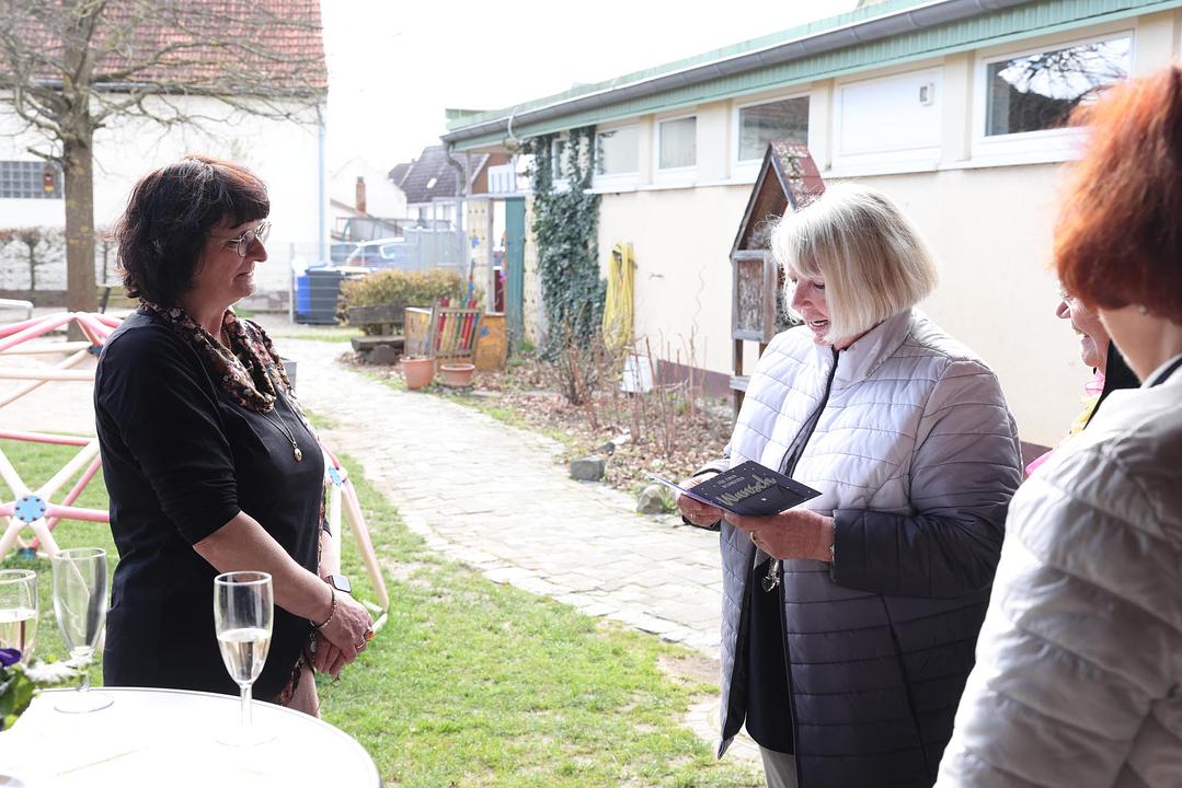 Nach einer kurzen Begrüßung blickten Bürgermeister Eike See und Hauptabteilungsleiter Markus Herrmann auf Dildines berufliche Laufbahn zurück. 1977 schloss sie ihre Ausbildung zur staatlich anerkannten Kinderpflegerin an der Wingertschule in Friedberg ab. Nach ihrer Tätigkeit als Kinderpflegerin im Kinderheim Butzbach und als Gruppenleiterin im Kindergarten in Rosbach verschlug es sie in den Odenwald, ehe es sie wieder in die Wetterau zurück zog. Zum 1. Januar 1994 trat sie in den Dienst der Gemeinde Wölfersheim ein. Zunächst als Springerin für alle Kitas und ab 1997 fest in der Kita Räuberhöhle in Melbach. Fachbereichsleiterin Nicole Stelzner-Lehmann dankte ihr für ihren langjährigen Einsatz. Sebastian Göbel vom Personalrat unterstrich die besondere Bedeutung des Kindergartens für den Ort und dass dies ohne die engagierten Kolleginnen sicher nicht so wäre. Kinder, die bei ihr den Kindergarten besucht haben, bringen inzwischen selbst ihre Kinder in die Kita Räuberhöhle. In all den Jahren arbeitete sie stets mit Einrichtungsleiterin Christina Mühl zusammen, die sich tränenreich verabschiedete und ihr ihren „Lieblingsstern“ überreichte. Der offizielle Teil endete mit einem Gruß und Liedbeitrag von Carina Hofmann für die Eltern. Auch zahlreiche aktuelle und ehemalige Kolleginnen und Kollegen waren zur Verabschiedung gekommen und nutzten die Gelegenheit Martina Dildine für die Zusammenarbeit zu denken. „Ich wünsche Martina Dildine für die Zukunft alles erdenklich Gute und vor allem Gesundheit und viel Zeit mit ihrer Familie. Ich danke ihr für ihren langjährigen Einsatz zum Wohle unserer Gemeinde und bin mir sicher, dass viele ihre herzliche Art vermissen werden,“ schließt Bürgermeister See ab.