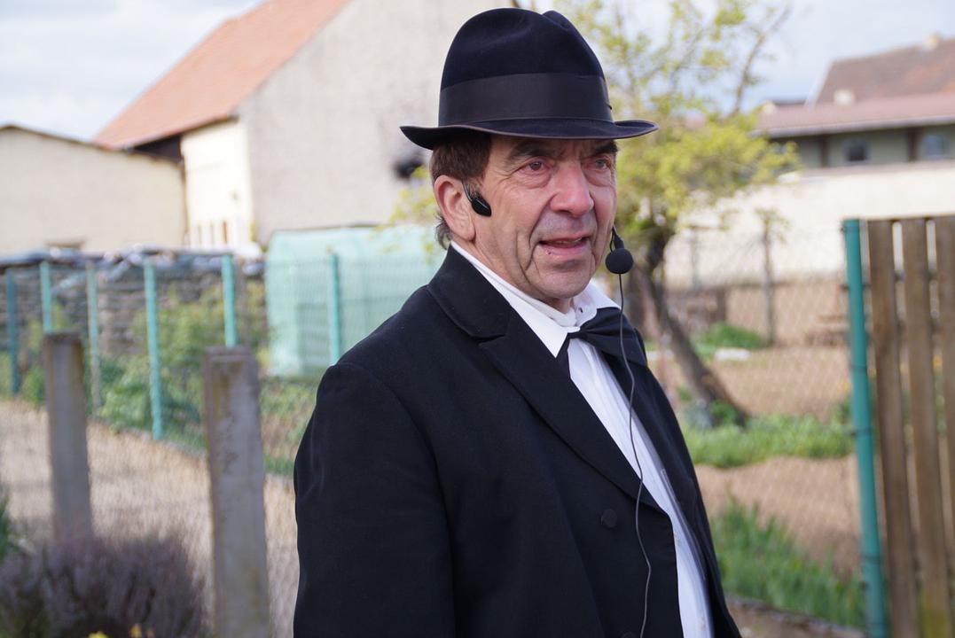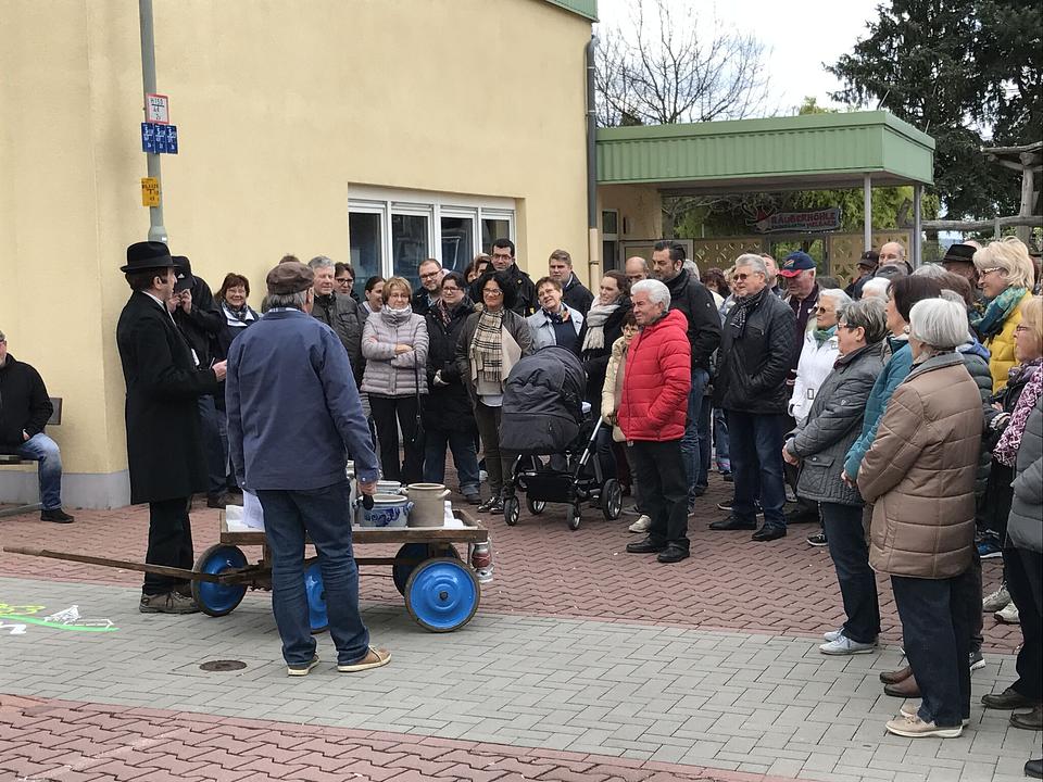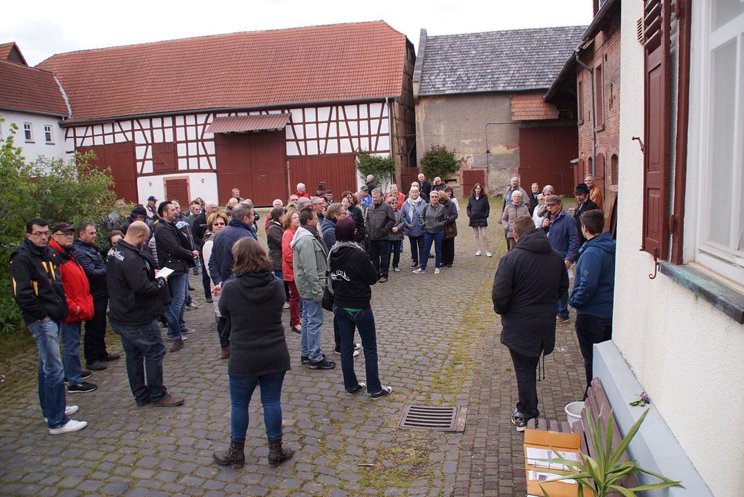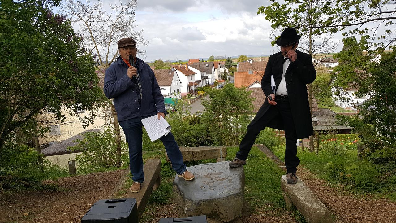 In den Rollen der historischen Berichterstatter bei den Dorfrundgängen, die aus ihrem eigenen „ale Dibbe“ erzählen wollten, sollten Hermann Schleuning und Volker Zorn auftreten. Die beiden legte zwei Rundgänge an 11 besonderen Stationen fest. In einer Mischung aus eigenen Erlebnissen ihrer Kinder- und Jugendzeit und historischen Fakten erarbeiteten Hermann Schleuning und Volker Zorn witzige und spannende Dialoge, die sie im örtlichen Dialekt vortrugen. Leider musste H. Schleuning wegen eines familiären Trauerfalls kurzfristig absagen. Der 1.Vorsitzende Karl-Ernst Kunkel sprang ein und meisterte diese Rolle, gemeinsam mit Volker Zorn, mit Bravour! Hier gilt Hermann Schleuning noch ein besonderer Dank, da er sein fertiges Konzept zur Verfügung stellte!