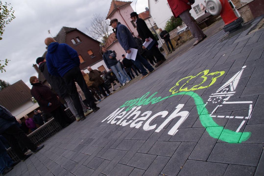 Wolfgang Weller und Thomas Gerlach begleiteten mit einer mobilen Übertragungstechnik die fast dreistündigen spannenden Ortsrundgänge. Hier sei der Firma Goliath Sound (M. Buss) für die Bereitstellung der Geräte gedankt! Volker Zorn und Karl-Ernst Kunkel präsentierten in historischen Kostümen die markanten Punkte im alten Ortskern und vermittelten auf humoristische Weise in Dialogform viel Wissenswertes aus der Geschichte Melbachs. Das von Nina Gerlach Logo entworfene Jubiläumslogo war von Wolfgang Weller und Gregor Stollberg vorher mittels einer Farbschablone auf den Boden an den Stationen aufgebracht worden und führte so die Teilnehmer vom Dorfgemeinschaftshaus über die Alte Schmiede und den Haag durch die verschlungenen Dorfstraßen. Im alten Hofgut der Familie Breidenbach ergänzte Frank Breidenbach die Erzählungen mit Beiträgen zur Geschichte des Hofes. Herta Grenzebach und Volker Zorn lockerten die Vorträge mit Anekdoten und lustigen, selbst verfassten Gedichten zu besonderen Erlebnissen auf. In der alten Schmiede und im Hof Zorn wurden, zur Freude der Besucher, zwei Verzehrstationen auf dem langen Weg angeboten. Den ursprünglich für den späten Abend geplanten Nachtwächterrundgang hatte man bereits im Vorfeld auf das kommende Jahr verschoben.