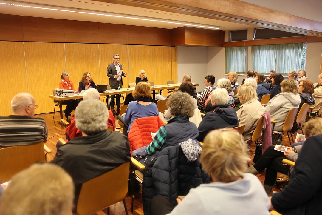 Bürgermeister Eike See begrüßte die zahlreichen Teilnehmer und ging zunächst auf die grundsätzlichen Ziele des Projektes ein. Dabei blickte er auch auf das bisherige Engagement der Gemeinde, zum Beispiel die regelmäßigen Seniorenausflüge und den Seniorennachmittag zurück. Ziel des Projektes sei es bereits bestehende Angebote sinnvoll zu ergänzen. Er übergab das Wort an Hilary Roger vom Malteser Hilfsdienst, die das Projekt gemeinsam mit ihrer Kollegin Mahnaz Jafary vorstellte. Mit dem Projekt sollen leicht zugängliche Angebote für ältere und hochaltrige Menschen geschaffen werden, die noch zuhause wohnen. Regelmäßige, gerne auch generationsübergreifende Begegnungen oder Unternehmungen sollen auf die Bedürfnisse älterer Menschen zugeschnitten werden. Dazu zählen beispielsweise Ausflüge oder Spaziergänge in andere Ortsteile oder Gemeinden, angeleiteter Seniorensport am Mehrgenerationenspielplatz am Wölfersheimer See oder in einer der Hallen, Vorträge zu verschiedenen Themen, gemeinsames Musizieren, Kochen oder Vorlesen sowie Erzählen in interkultureller Runde. Die Angebote sind für Seniorinnen und Senioren kostenlos und zielen darauf ab, ein selbstständiges, zufriedenes und aktives Leben in der Gemeinde zu ermöglichen. Bürgerinnen und Bürger aus allen Generationen sind aufgerufen, sich einzubringen – mit eigenen Ideen, Möglichkeiten und im eigenen Zeitrahmen. Sie führte zahlreiche Beispiele aus anderen Städten und Gemeinden wie Büdigen, Butzbach oder Altenstadt auf.