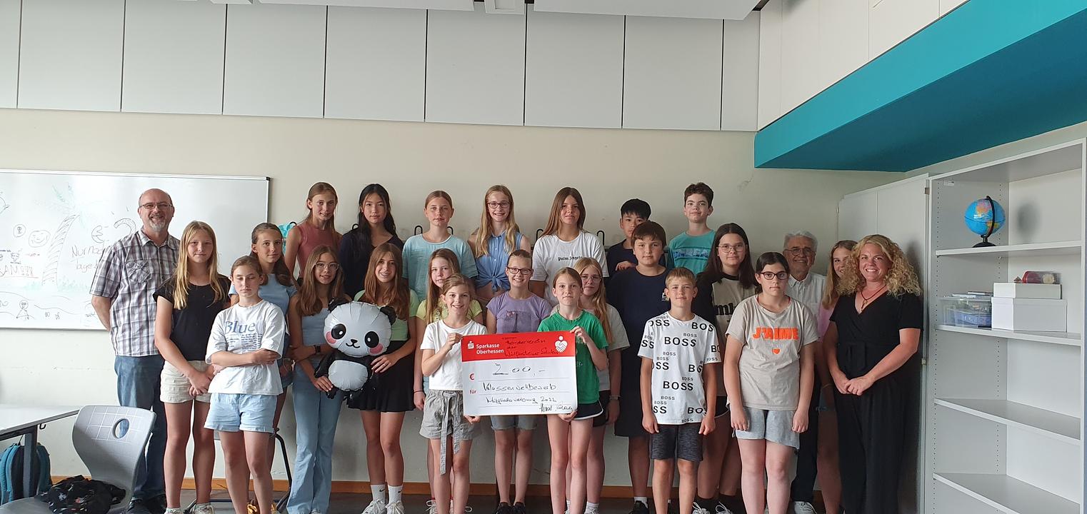 In jedem Schuljahr führt der Förderverein der Wölfersheimer Schulen an der Jim-Knopf-Schule und der Singbergschule einen Klassenwettbewerb in den neuen Klassen 1 und 5 durch. Es geht dabei darum, neue Mitglieder zu werben, bzw. den bisherigen Bestand an Mitgliedern in der jeweiligen Klasse zu dokumentieren. Der Förderverein unterstützt seine Schulen jedes Jahr mit großzügigen Spenden für Unterrichtsmaterialien und viele Projekte. Coronabedingt kam es im vergangenen Jahr zu einer Verzögerung der Ehrungen, diese konnten jetzt durchgeführt werden. Den Klassenwettbewerb für das Jahr 2022 gewann die damalige Klasse 1d . In Anwesenheit der Klassenleiterin Christina Scop und des Schulleitungsteams der Jim-Knopf-Schule mit Rektorin Viola Ehm und Konrektor Rainer Montag übergaben der 1. Vorsitzende Thomas Gerlach und die 2. Vorsitzende Christa Diether der Klasse den Siegerscheck in Höhe von 200,-€ für die Klassenkasse. Den Klassenwettbewerb in der Singbergschule gewann die damalige Klasse 5G1 mit ihrer Klassenleiterin Christine Happ. Hier waren Thomas Gerlach und Thomas Seeling zur Ehrung gekommen. Der Förderverein gratuliert den Siegerklassen ganz herzlich!