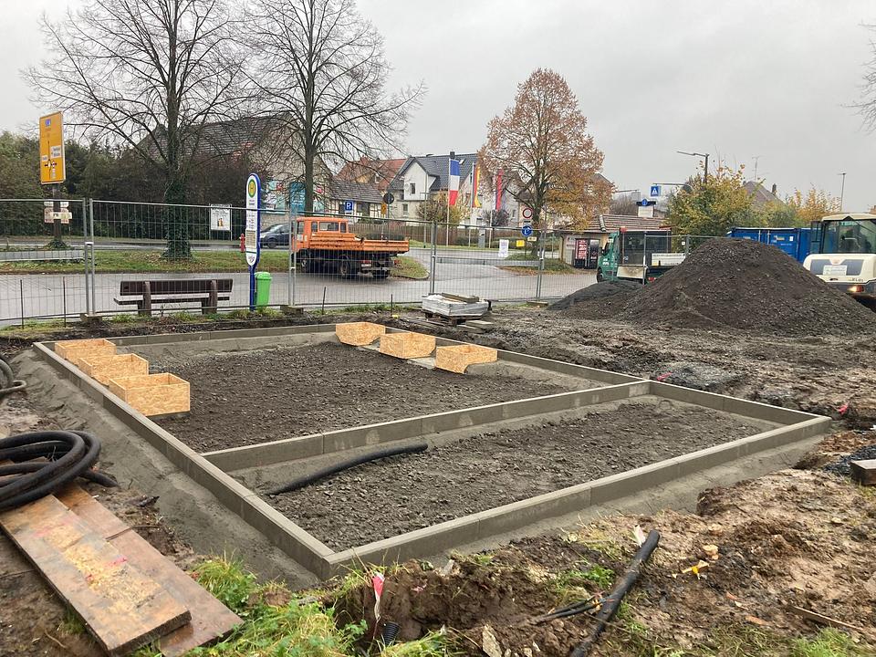 Vor einigen Tagen konnte dann mit den eigentlichen Arbeiten an der Abstellanlage begonnen werden. Hierfür wurden zunächst die massiven Fundamente für die Dachkonstruktion hergestellt. Anschließend konnten die Randsteine für den gepflasterten Bereich gesetzt werden. Bereits jetzt wird deutlich, dass die Abstellanlage wesentlich größer ist als die Anlagen am Rathaus oder Wölfersheimer See. Neben 16 normalen Radabstellplätzen werden auch 6 Radboxen entstehen. Dabei handelt es sich um eine Art „Mini-Garage“ in der Räder komplett eingeschlossen werden können. Insbesondere für teurere E-Bikes bietet sich damit eine gute Abstellmöglichkeit. Die Nutzung ist vergleichbar mit einer Schwimmbadumkleide einfach über ein Münz-Pfand-System möglich. Die Radboxen verfügen auch über entsprechende Möglichkeiten ein E-Bike zu laden.