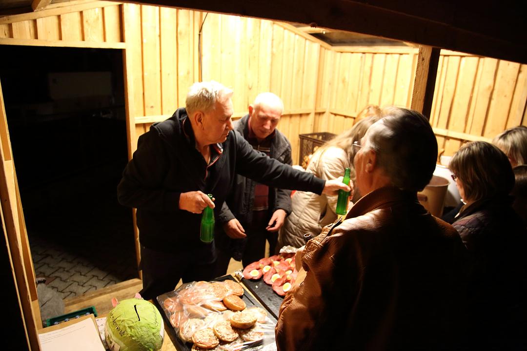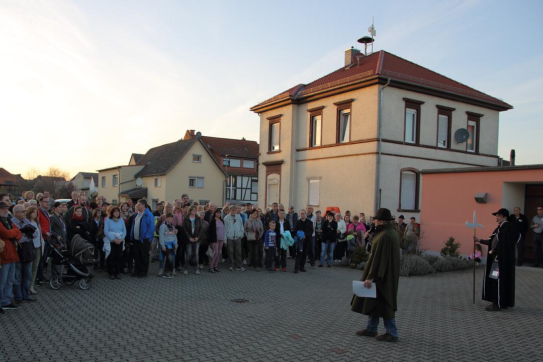 Am Ende des Rundgangs bedankte sich der 1. Vorsitzende, Karl-Ernst Kunkel, bei den zahlreichen Gästen für die große Resonanz, den Vereinsmitgliedern für ihre Organisation und die Durchführung der Veranstaltung und Wolfgang Weller und Thomas Gerlach für die drahtlose, technische Unterstützung und lud zu einem vorbereiteten Imbiss und Umtrunk, der in dem Unkostenbeitrag enthalten war, auf den Kirchhof ein. Weitere Veranstaltungen im Rahmen des Dorfjubiläums folgen in den nächsten Wochen und Monaten. So wird am 29. April die akademische Feier mit einem Gottesdienst, der Baumpflanzung einer neuen Dorf-Kastanie auf dem Kirchhof und einem Rahmenprogramm im Dorfgemeinschaftshaus durchgeführt.