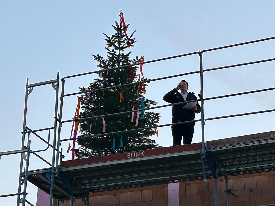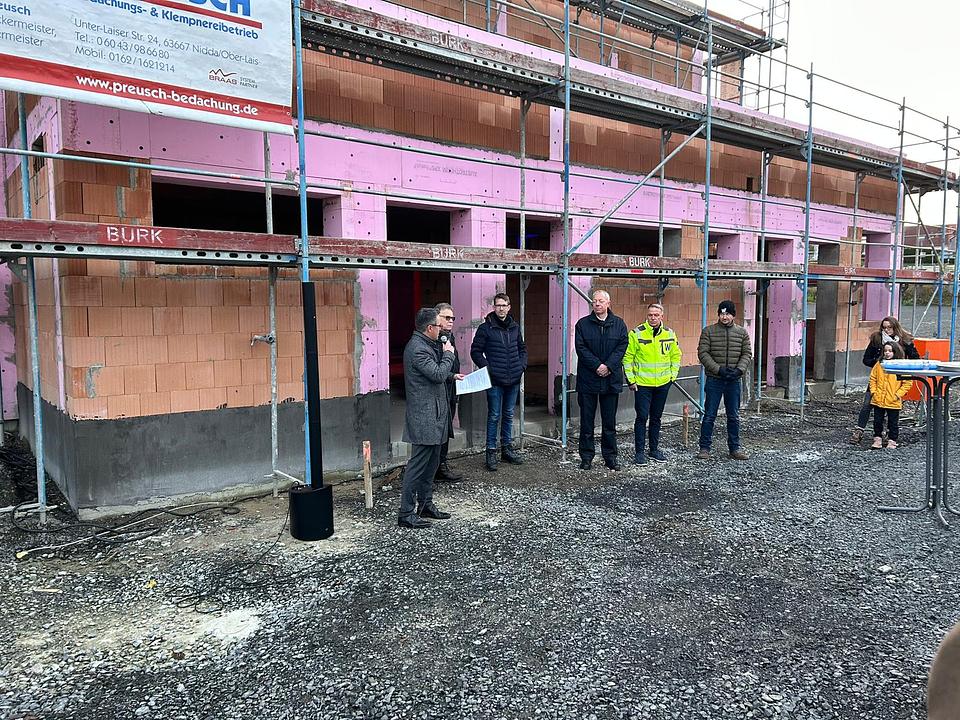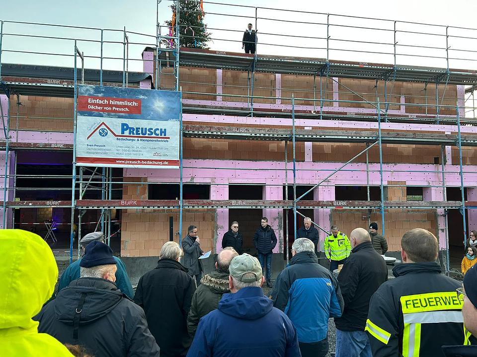Neben Bürgermeister See waren auch die Projektverantwortlichen Anton Krippner, Markus Michel und das Architekturbüro von der Heid zugegen, um Fragen zum Bauprojekt zu beantworten. Krippner ging zudem auf die aktuellen Entwicklungen ein, bevor der Zimmerman am höchsten Punkt des Gebäudes das Wort erhielt. Extra für diesen Anlass gereimt trug er den Richtspruch vor und warf traditionell das Glas vom Dach herunter, wodurch das Haus vor Unheil geschützt werden soll.