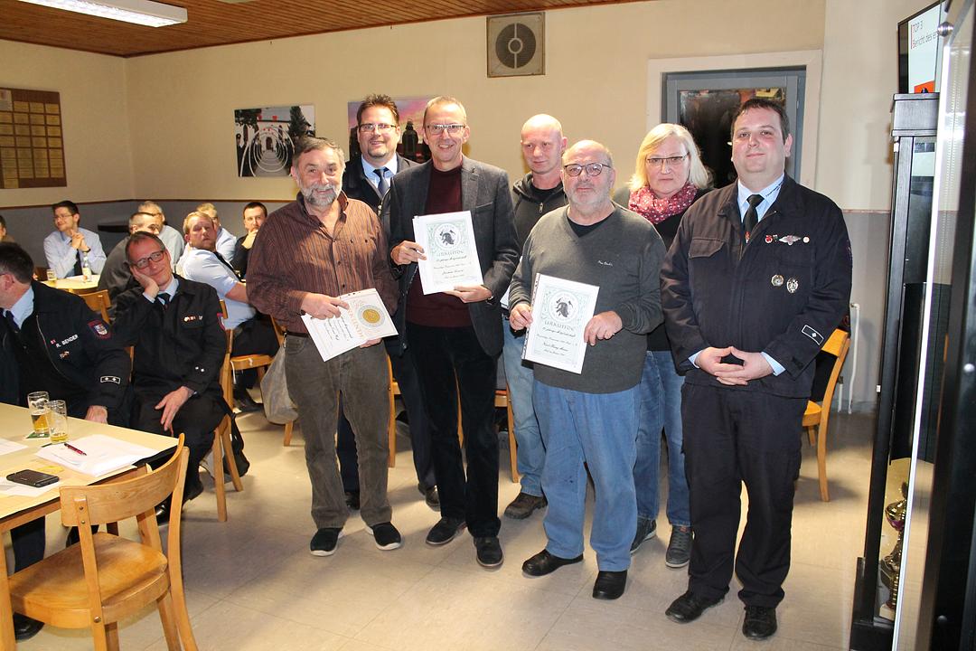 Kreisbrandmeister Matthias Meffert eröffnete den Block der Ehrungen. Für 25 Jahre aktiven Feuerwehrdienst konnte er Dirk Meisinger die bronzene Ehrenmedaille vom Bezirksfeuerwehrverband überreichen. Passender hätte der Überbringer nicht gewählt werden können, hatte Meisinger doch einst seine Feuerwehrkarriere in Mefferts Heimatwehr Bad Vilbel begonnen. Bürgermeister Rouven Kötter zeichnete traditionell die Kameraden mit den meisten Einsätzen aus. Über eine Powerbank konnten sich die Kameraden Marcel und Dennis Müller, Hans-Georg Scheld sowie erneut Dirk Meisinger freuen. Der Vereinsvorsitzende Roland Wagner ehrte für 50jährige Vereinstreue Philipp-Ernst Weiß. Fest-Schirmherr Joachim Arnold, das Ehepaar Karl-Heinz und Christina Meier, Andreas Kneiske sowie Maxi Mück blicken auf stolze 25 Jahre Mitgliedschaft zurück. Allen Geehrten überreichte die Wehrführung je eine Urkunde sowie ein kleines Präsent als Anerkennung.