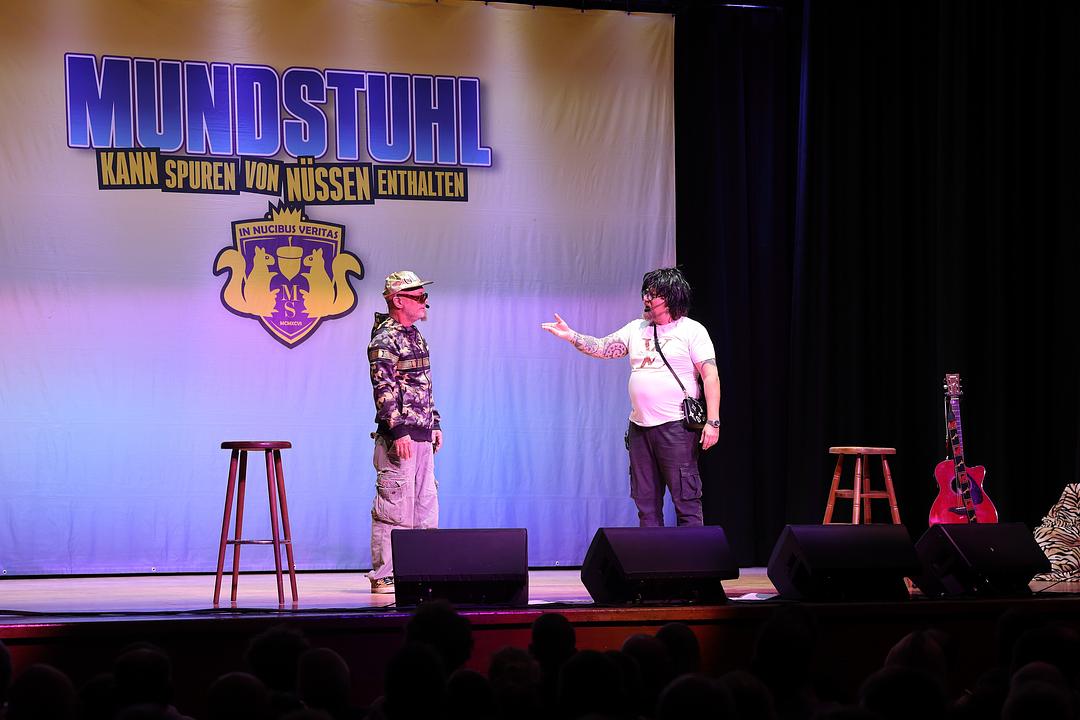 Der Titel ihres Programms liest sich wie eine Warnung und eine solche in Form von „Vorsicht, Lachsturm!“ hätte auch am Eingang der Wetterauhalle stehen können. Was Mundstuhl an diesem Abend boten, war ein Feuerwerk an Spitzen und Scherzen, die manchmal bewusst die Grenzen des guten Geschmacks streiften. Ihr humoristisches Feingefühl ließ selbst Tabuwörter charmant und witzig erscheinen, womit sie eindeutig den Nerv des Publikums trafen. Mundstuhl zeigten ihr Können durch eine Reihe von Charakteren, die sie mit Geschick zum Leben erweckten. Von den ostdeutschen Hartz-IV-Müttern Peggy und Sandy über das verstrahlte Friedensaktivisten-Duo Malte und Torben bis hin zu den skurrilen Zauberern Siegroy und Fried – jedes Alter Ego trug dazu bei, dass die Lacher kein Ende nahmen.