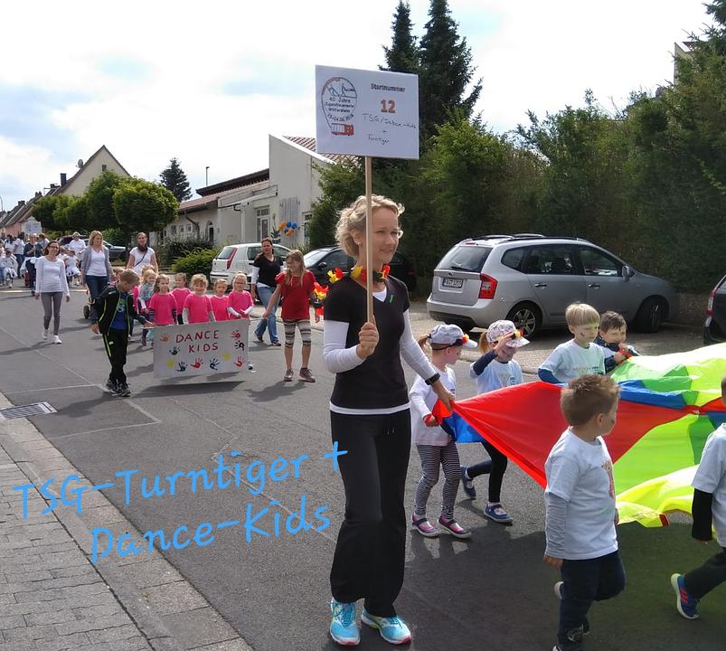 Zum 40 jährigen Jubiläum der Jugendfeuerwehr Wölfersheim nahmen die TSG- Dance-Kids und Turntiger mit ihren ÜL Sandra Tauber und Petra Weinelt am Umzug teil.