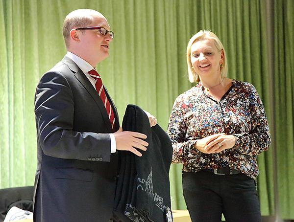 Die Besucher im Vereinsraum der Mehrzweckhalle bestätigten Jacobs Aussage, dass neben dem materiellen Verlust auch die psychischen Folgen häufig eine Rolle spielen. "Wir hatten schon Opfer, die letztlich ausziehen mussten. Man darf das nicht unterschätzen, denn der Täter hat in den intimsten Sachen gewühlt. Da ist der Ekel extrem groß. Das Sicherheitsgefühl, das vom eigenen Heim ausgeht, kann verloren gehen." Im Ernstfall sollte man auf jeden Fall den Notruf 110 verständigen. Täter wollen im Regelfall um jeden Preis flüchten und es sei der falsche Moment, den Helden zu spielen. Um sich besser schützen zu können, bietet die Polizei auch kostenlose Beratungen vor Ort an. Eine solche hat auch Bürgermeister Rouven Kötter in Anspruch genommen. "Ich kann diese Beratung nur jedem empfehlen. Man bekommt Schwachstellen aufgezeigt, die man selbst evtl. gar nicht gesehen hat." so Kötter. In seinem Schlusswort dankte er Jacob für die gemeinsame Aktion und überreichte ihr, passend zur dunklen Jahreszeit, den ersten Wölfersheim-Kolter. "Der Vortrag war informativ und trägt einen Beitrag zur Sicherheit unserer Bürger bei. Ich hoffe, dass wir in den nächsten Jahren weitere Vorträge in Zusammenarbeit mit der Polizei anbieten können." so Kötter.