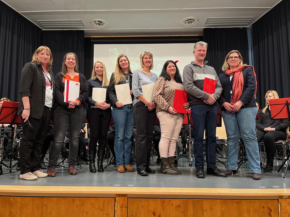 Zu Beginn des Abends gab Kathrin Storck einen Rückblick auf das vergangene Jahr. 2022 war wieder ein einschränkungsfreier Übungsbetrieb möglich und auch Vereinsveranstaltungen konnten wieder im gewohnten Rahmen stattfinden. Viele Kinder sind im Turnen aktiv, so dass der Verein acht Kinderturngruppen stellen kann, auch waren die Teilnehmerzahlen der Kinder beim Vereinsturnen, sowie am Gaukinder- und Landesturnfest sehr zufriedenstellend. Die Volleyballabteilung freut sich über viele jugendliche SpielerInnen. Bei der Musikabteilung ist der Neustart ebenfalls gelungen und das Blasorchester konnte sich im November über ein ausverkauftes Konzert freuen.