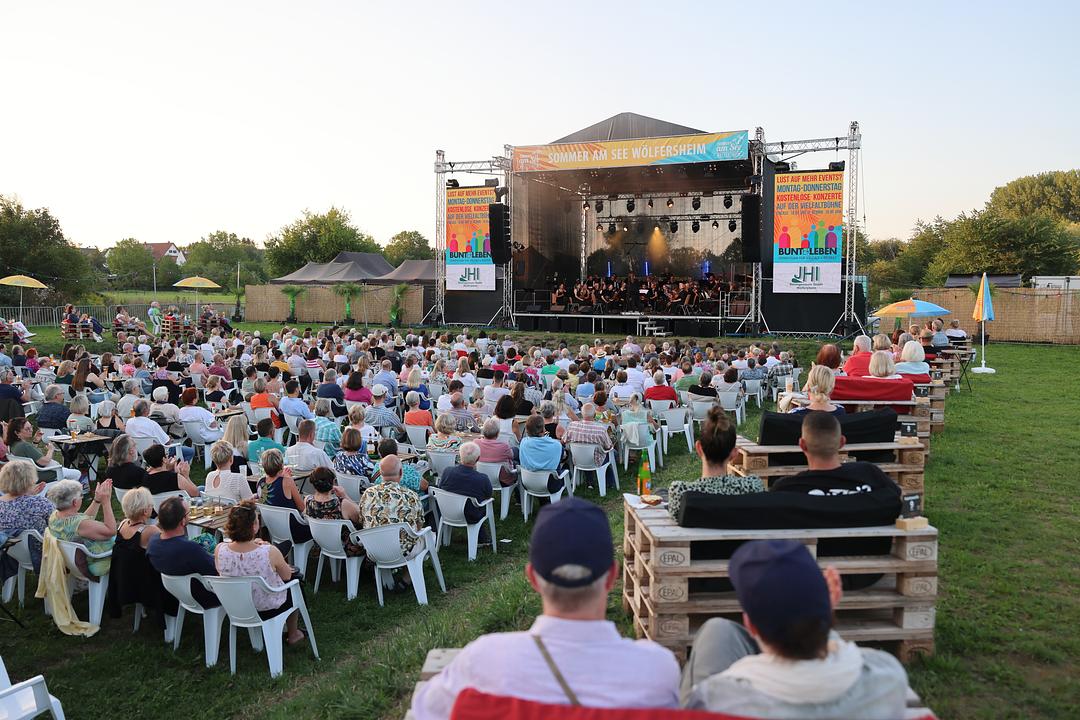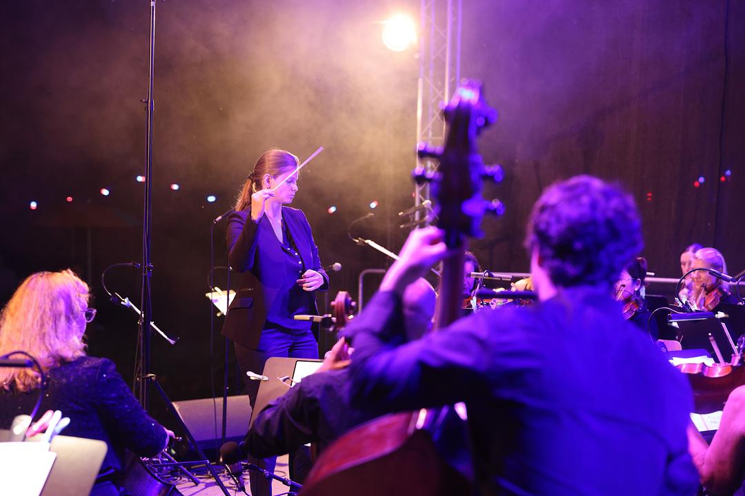 Mit dem erst eine Woche vorher traditionell beim Offenbacher Lichterfest zur Premiere gebrachten neuen Programm „Komm aufs Meer!“ servierte das Sinfonieorchester sogar noch mehr Facetten als bei seinem ersten Gastspiel am See im vergangenen Sommer. Für die enorm facettenreiche Klanglichkeit sorgte alleine schon die erst 31jährige Dirigentin Katharina Müllner, die unter anderem im Herbst an der Semperoper in Dresden gastiert. Am Sonntag aber eben in der Wetterau. Hochpräzise und dabei genauso locker wie bis in die Fingerspitzen musikalisch verlieh sie noch dem kürzesten Stückchen (das war die „Magnum“-Titelmusik mit einer knappen Minute Spielzeit) ausgeprägten Charakter. Das ließ zunächst die Klassik-Stücke herrlich atmen – Antonio Salieris selten gehörte Ouvertüre „La Tempesta di Mare“ (die es an Showeffekt locker mit Vivaldis „Sommer“ aufnehmen kann) ebenso wie Camille Saint-Saëns unendlich schönes „Aquarium“, das Müllner raffiniert glitzern ließ; man hörte die Lichtreflexe geradezu heraus. Jan Polivka bot dabei den solistischen Klavierpart so brillant wie zurückgenommen.