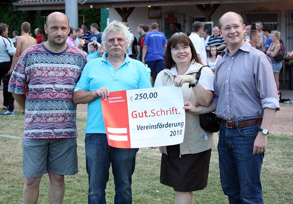 …erhielt der FC Wohnbach unlängst aus dem Topf der Wölfersheimer Vereinsförderung. Bürgermeister Rouven Kötter und die Vorsitzende des Ausschusses für Sport, Kultur, Jugend und Soziales, Carmen Körschner, übergaben im Rahmen des Gemeindepokals einen Scheck über 250 Euro an den Vorsitzenden Manfred Pfister und Andreas Bommersheim.