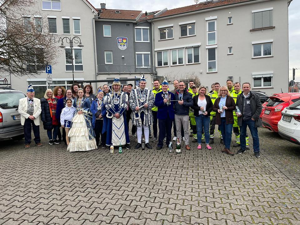 Die Rathausstürmung der Wölfersheimer Narren gehört inzwischen zur guten Tradition. In Wölfersheim geht man neben der symbolischen Stürmung noch weiter und hält sogar eine Narrensprechstunde ab, in der der Schlüssel zur Gemeinde wieder in die vertrauensvollen Hände des Bürgermeisters übergeben wird. Am Montag wurden die Tollitäten der Motten von Bürgermeister Eike See und den Mitarbeitern des Rathauses und des Betriebshofes auf dem Parkplatz des Rathauses empfangen.