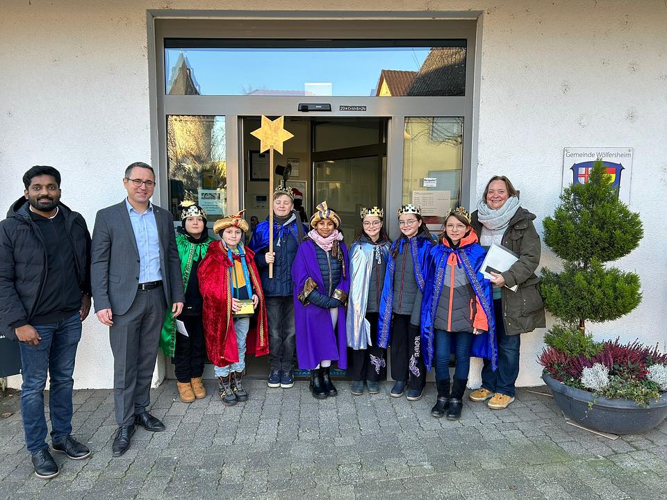 In der vergangenen Woche besuchten die Sternsinger der Wölfersheimer katholischen Kirche die Mitarbeiter des Rathauses. Gemäß altem Brauch sangen sie einige Lieder, trugen ein Gedicht vor und bedachten das Wölfersheimer Rathaus mit ihrer Segensbitte „20*C+M+B*24“, die das Rathaus und die darin arbeitenden Menschen vor Unglück schützen soll.