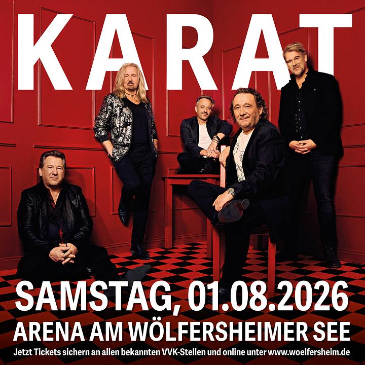 KARAT steht für über fünf Jahrzehnte deutschsprachiger Rock- und Popgeschichte - Hits wie „Über sieben Brücken“ oder „Der blaue Planet“ sind längst Klassiker. Die Berliner Kultband kommt nach Wölfersheim: Am Samstag, 1. August 2026, ist die Band im Rahmen der Veranstaltungsreihe „Sommer am See“ zu Gast in der Arena am Wölfersheimer See - ein Open-Air-Highlight nicht nur für Rockfans.
